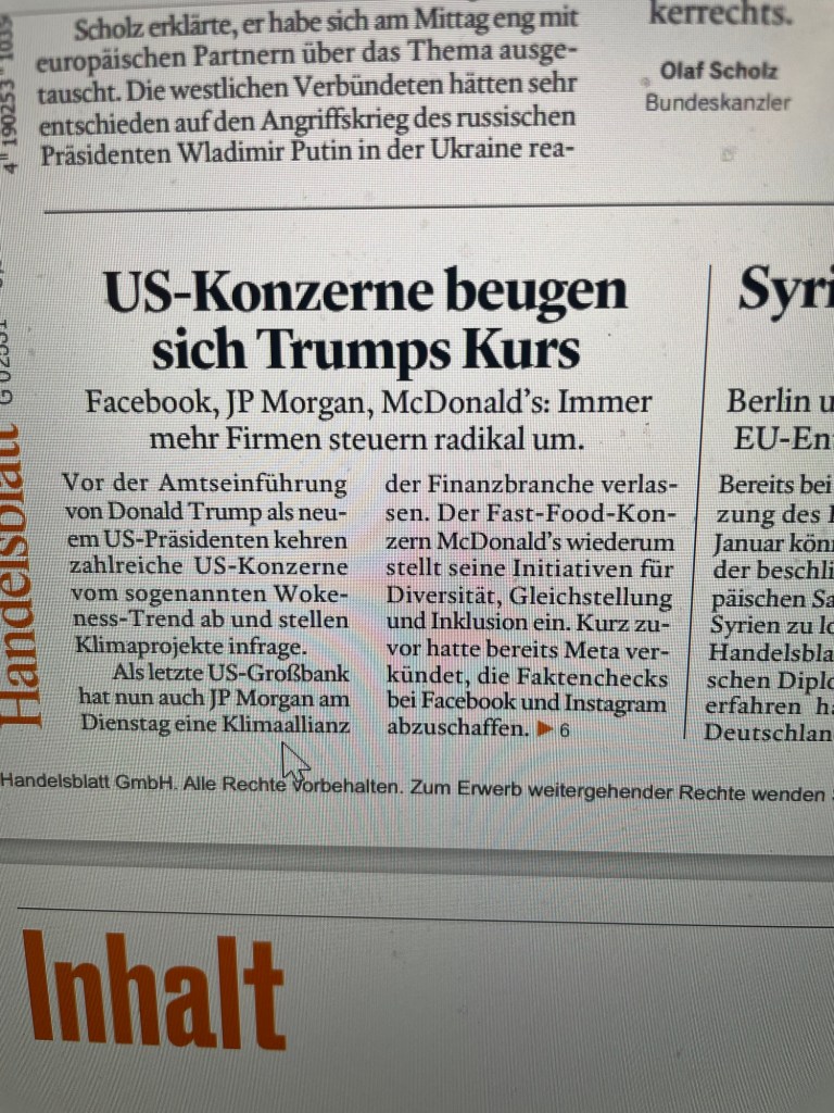 Als Nächstes werden die Industriebosse von Siemens bis VW nach Staatsgeld rufen, um die eigenen Diversitäts-Programme gegen den Willen der amerikanischen Regierung aufrecht erhalten zu können. Wenn Sie dies eingesteckt haben, stellen Sie die Programme sofort ein, mit Hinweis auf die wirtschaftlichen Notwendigkeiten.